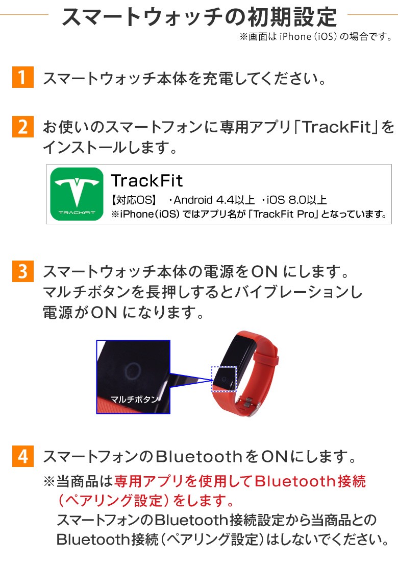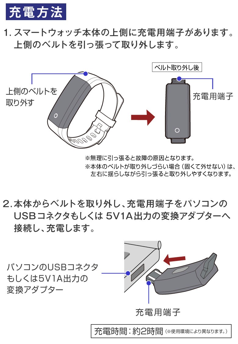 | 留意事項 | ※本製品はBluetooth対応のすべてのスマートフォンとの動作確認を保証したものではありません。 ※本製品は海外製品です。専用アプリの詳細や利用方法、アプリに関連した製品の不具合などについて弊社ではご対応およびご回答はいたしかねます。 ※OSやアプリのアップデートにより本製品が使用不能になった場合の保証はいたしかねます。 ※本製品は生活防水仕様です。着用したままの入浴やシャワー、水泳など長時間本製品を水に浸す可能性がある場合は取り外してください。 ※本体の充電用端子は防水ではありません。水や液体が触れないようにご注意ください。 ※本製品は医療機器ではありません。測定の数値が実際とは異なる場合があります。あくまで参考値としてご利用ください。 ※着信お知らせ機能は、スマートフォンに電話着信があった際にスマートウォッチ本体がバイブレーションします。スマートウォッチ本体から電話応答はできません。 |