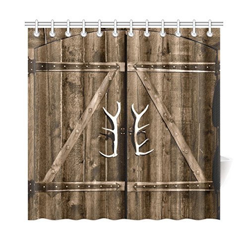 InterestPrint Wooden Garage Barn Door Shower Curtain, Vintage Rustic Country Wooden Gate with Antler Handles Decor Fabric Bathroom Set with Hooks, 72 X 72 Inches Long, Brown