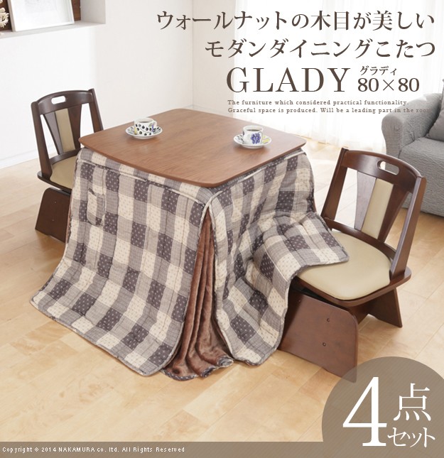 こたつ 北欧 正方形 モダンダイニングこたつ グラディ 80×80cm4点セット(こたつ+専用省スペース布団+回転椅子2脚)