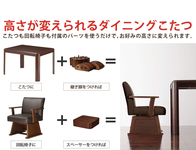 セット内容:こたつx1台、こたつ布団x1枚、肘付回転椅子x1脚