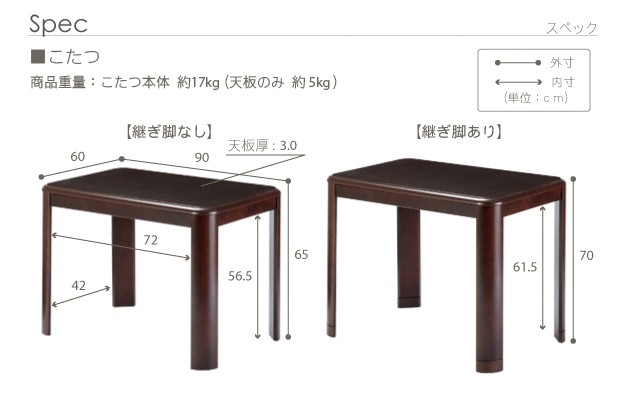 サイズ(cm):こたつ-幅90x奥行60x高さ70(65)・約17kg、椅子-幅57x奥行54x高さ72(67)・約10.5kg、布団-250x220cm・中綿量約950g
