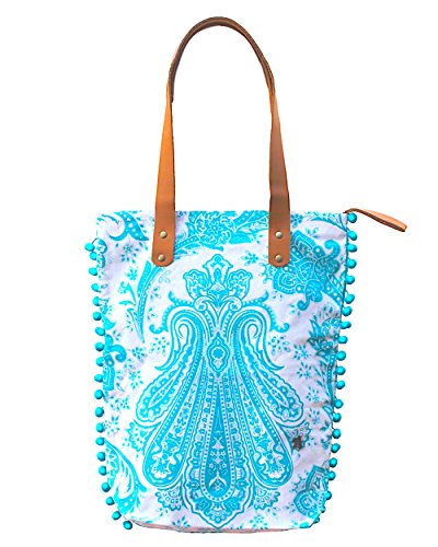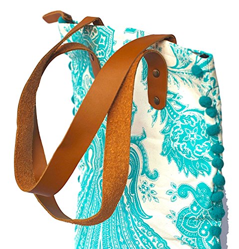 AKITAI Bohemian Bags Summer Idea Turquoise Paisley Canvas Bohemian Pompom Tote Shopping Bag