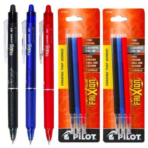 - Deal includes: 3 each Pilot FriXion Ball Clicker, Retractable 0.7mm Erasable Assorted Gel Ink Pens, plus 2 packs of assorted erasable gel ink refills, with 3 refills per pack.