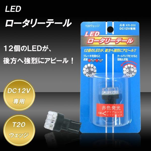 12個のLEDが、ブレーキを踏むと点滅し、テールランプをつけると回転&反転するロータリーテールバルブです。純正テール球をはずし取り替えるだけの簡単取付です。 製造国:中国 素材・材質:合成樹脂、スチール 商品サイズ:高さ35×直径25mm(最大部) 仕様:DC12V専用LEDカラー:赤(LED12個)T20差込タイプ※お届け地域により、別途運賃がかかる場合やお届けできない場合がございますので、お問い合わせ下さい。
