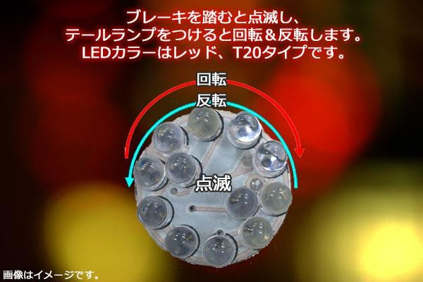 | 12個のLEDが、ブレーキを踏むと点滅し、テールランプをつけると回転&反転するロータリーテールバルブです。純正テール球をはずし取り替えるだけの簡単取付です。 |