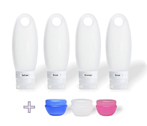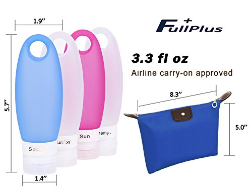 -. Binding : Misc. -. Brand : FullPlus -. Feature : 100% BPA Free. Fill the Lotion, Cosmetics and Other Airline Travel Essentials Casually / Set of 3 small bottles, 3.3oz, perfect for shampoo,easy to carry,TSA Airline carry-on approved / The bottle design with several pre-printed label on the lid for you to identify contents in the bottle / Leak-proof design bottle lid, create 3 layers protection to prevent drop, leaks and spills / Come with a hole on the main body of the bottle, hang it to a hook to squeeze out the shampoo -. IsAdultProduct : 0 -. Label : FullPlus -. Manufacturer : FullPlus -. MPN : FPSB-4C -. PartNumber : FPSB-4C -. ProductGroup : Beauty -. ProductTypeName : BEAUTY -. Publisher : FullPlus -. Studio : FullPlus -. Title : FullPlus Silicone Travel Bottle Set 3.3 Oz 4 Pack TSA Approved Carry On Shampoo Conditioner Bottle Leak Proof Design BPA Free with Cosmetics Bag