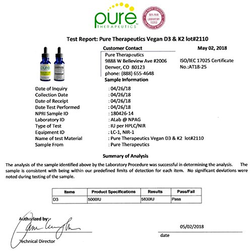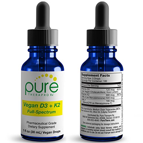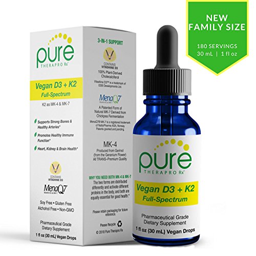 Why you need to take D3 and K2 together Many people take Vitamin D and calcium supplements thinking they're helping their bones, the truth is without the addition of Vitamin K2, such a health regimen could prove dangerous. Without Vitamin K2, the body cannot direct calcium to the bones where it's needed; instead, the calcium resides in soft tissue (like the arteries).* Vitamin K deficiency is widespread-even in healthy adults. To get the range of benefits that Vitamin K offers, you must take Vitamin K2 as a supplement, food sources are limited, at best. Vitamin K2 is a fat-soluble substance and is needed for normal blood coagulation. Vitamin K2 has been shown to inhibit calcium deposits (i.e., calcification) in blood vessels and even improve arterial flexibility.* Why you need both MK-4 and MK-7 - MK-4 and MK-7 are distributed differently and activate different proteins in the body, but both are equally essential for good health* - MK-4 is the key Vitamin K2 found in the brain * - MK-4 travels across the placenta to the developing fetus. MK-7 does not reach the fetus * Vegan D3 + K2 "Full Spectrum" contains 100% PURE TRANS MK-7. Trans MK-7 is the most absorbable form, as it's found in nature / whole foods and is recognized and absorbed by the body. The CIS form of MK-7 is not nature-identical and has limited activity/absorption. All Pure Therapeutics Formulas Meet or Exceed cGMP Quality Standards. This product is manufactured in the United States in a GMP-certified facility.Feature