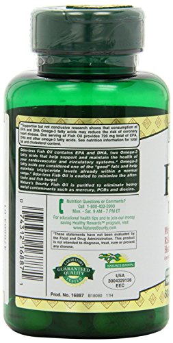 Nature's Bounty Fish Oil 1200 mg contains EPA and DHA, two Omega-3 fatty acids that help support and maintain the health of your cardiovascular system.* Omega-3 fatty acids are considered "good" fats important for cellular, heart and metabolic health and help maintain triglyceride levels already within a normal range.*Feature