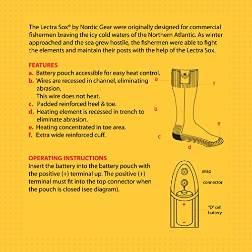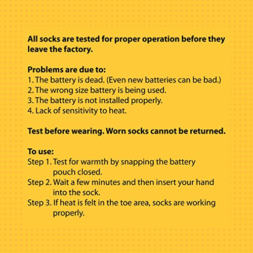 Wool blend (17% Wool) heated socks provide 6-8 hours of warmth. Uses "D" cell batteries (not included).