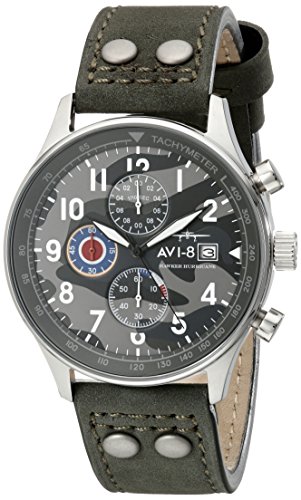 -. Binding : Watch -. Brand : AVI-8 -. Color : grey -. Department : mens -. EAN : 0814097020465 -. Feature : Round watch with camo-print dial featuring date display at 3 o'clock, tachymeter around border, and trio of subdials / 42 mm stainless steel case with mineral dial window / Japanese quartz movement with analog display / Suede leather band with metallic studs and buckle closure / Water resistant to 50 m (165 ft): In general, suitable for short periods of recreational swimming, but not diving or snorkeling -. IsAdultProduct : 0 -. Label : AVI-8 -. Manufacturer : AVI-8 -. Model : AV-4011-0A -. MPN : AV-4011-0A -. NumberOfItems : 1 -. PackageQuantity : 1 -. PartNumber : AV-4011-0A -. ProductGroup : Watch -. ProductTypeName : WATCH -. Publisher : AVI-8 -. Size : Standard -. Studio : AVI-8 -. Title : AVI-8 Men's AV-4011-0A Hawker Hurricane Analog Display Japanese Quartz Green Watch -. UPC : 814097020465 -. Warranty : Manufacturer
