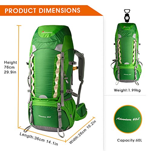 -. Feature : HIGH-CAPACITY-60L (3,661 cube inches); High quality professional backpack for camping, hiking and backpacking, designed to be comfortable and functionally versatile. Main compartment, sleeping bag compartment, bladder compartment, hip-belt pockets, top lid pockets and side pockets to keep your stuff separate and organized. / WATERPROOF-Water-resistant Nylon as the fabric can quickly slide water aside before water has a chance to penetrate it. Also an integrated rain stored in the bottom pocket, protect the whole pack from rain. / TOOL ATTACHMENT POINTS-Daisy chains, D-shape hooks, compression straps, bottom loops, soft latching loops, key rings and bottom straps for hanging tools, trekking pole, tents, sleeping bags, and other accessory / CR POWER FRAME SYSTEM-Serves to support the pack and distribute the weight of its contents across the body more appropriately, by transferring much of the weight to the hips and legs. 8 different adjustable sizes to fit your height. / LIGHTWEIGHT & COMFPRTABLE-Weight only 4.1 lb (1.85 kg), Padded and breathable mesh back panel and shoulder straps offer cushioned comfort, while also promoting air circulation along your back and shoulders.