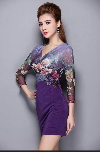 花柄/長袖/ビジュー/タイト/紫/ミニ丈