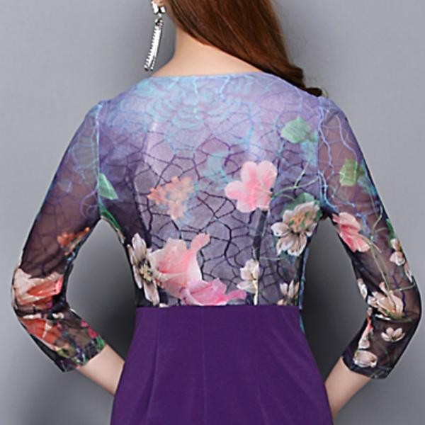 ハイウエスト切替 花柄メッシュ 長袖 ビジュータイトワンピース 紫/ L