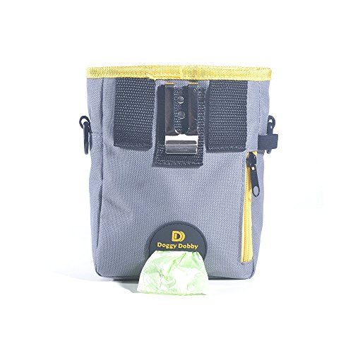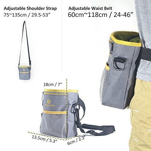 The Doggy Dobby Treat Pouch is an improved product after full researches of user's requirements.The length of waist belt and shoulder belt are customized according to statistical data,which provide comfortable wearing and convenient use.This dog treat training pouch is perfect for your dog walking and training,the size and pouch design is great for carrying our dog treats, kibble, toys,and your personal stuffs, such as keys, cash,cards,wallet and phone. Overall,this treat pouch won't let you down,it will be very convenient and helpful for your life. ? Material: Waterproof Nylon Fiber,Metal Buckles The item including: 1 x treat pouch (18*13.5*6cm / 7*5.3*2.3 inches, Grey) 1 x adjustable waist belt (60cm~118cm/24-46 inches)? 1 x adjustable shoulder strap (75-135cm / 29.5-53 inches)
