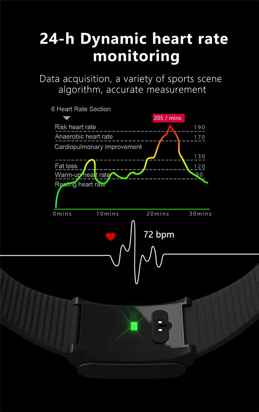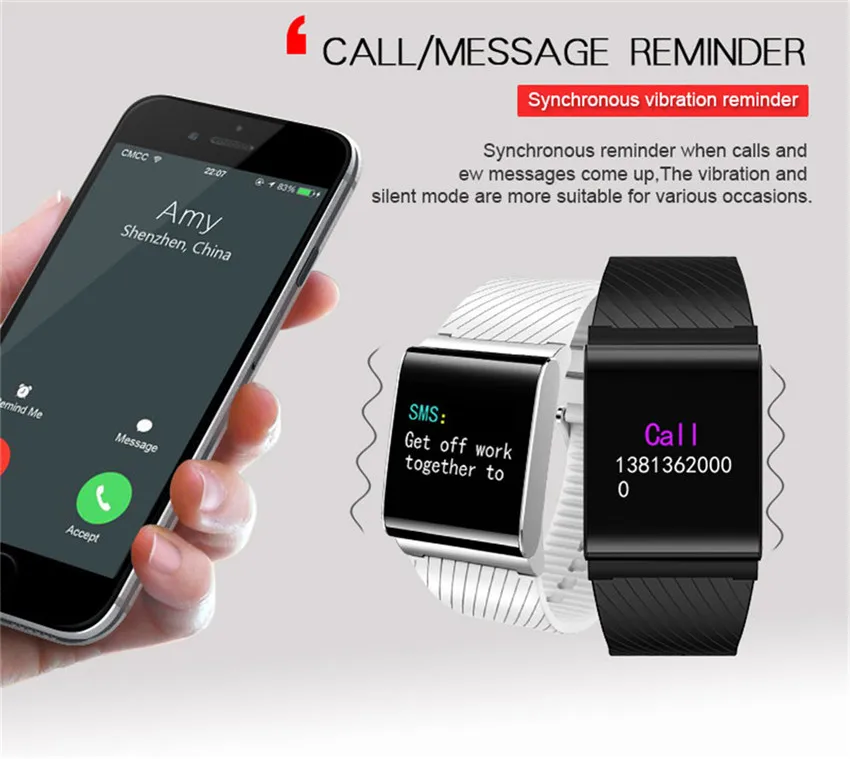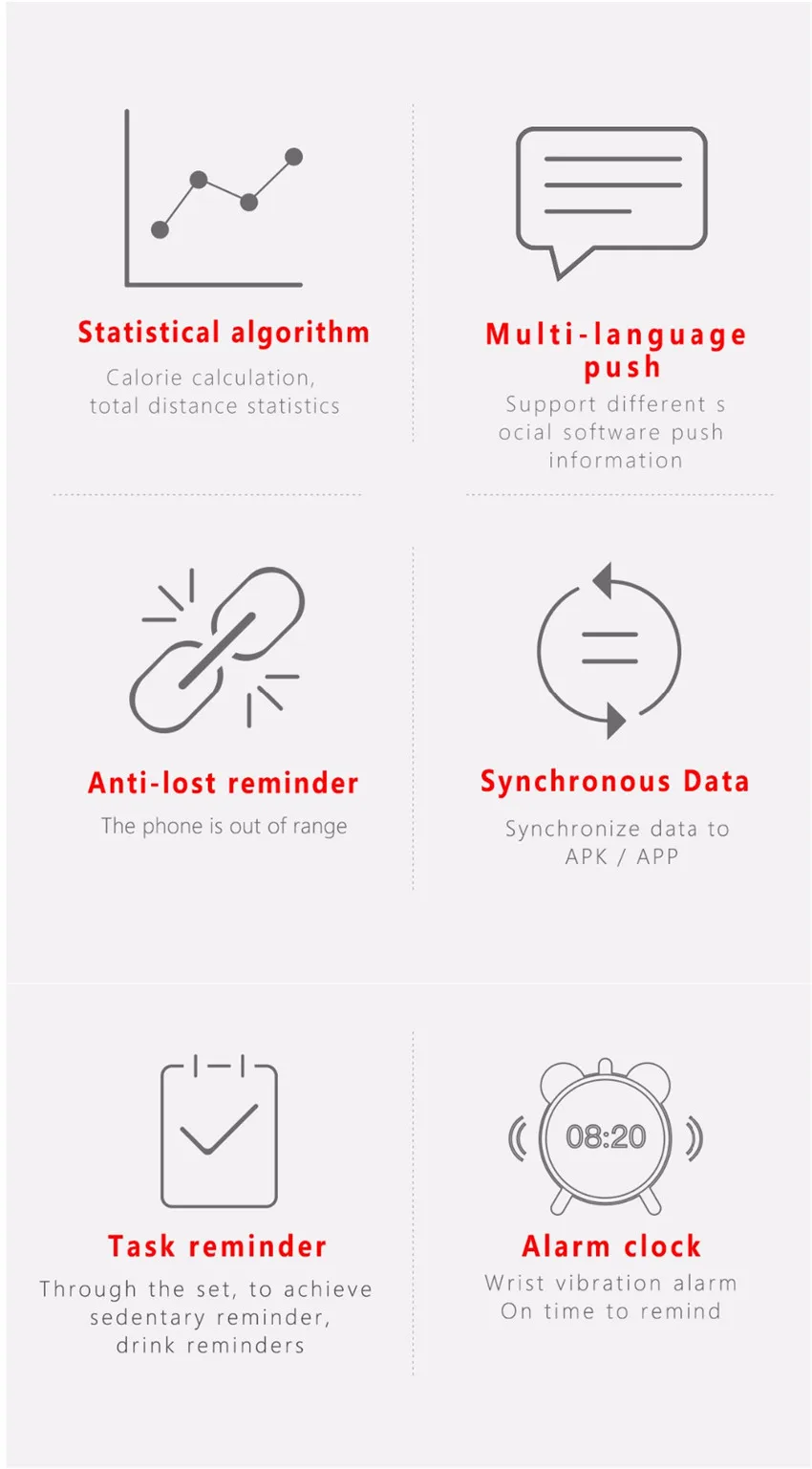 Function:Chronograph,Remote Control,Alarm Clock,Passometer,Message Reminder,Heart Rate Tracker,Call Reminder,Fitness Tracker