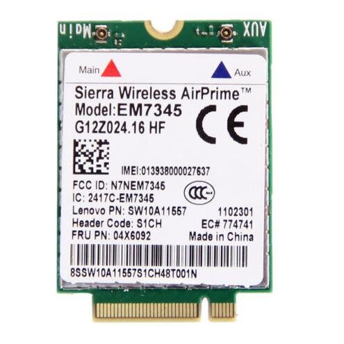 -. Feature : Model: EM7345, FRU/MPN: 04X6014 / 04X6092 / Interface:NGFF(M.2), DO NOT USE FOR HALF MINI PCI-E INTERFACE, ONLY FOR NGFF INTERFACE / Network type: LTE-FDD,HSPA+,GSM / GPRS / EDGE / ONLY USE FOR LENOVO & THINKPAD LAPTOP. DO NOT SUPPORT DELL & HP & OTHER LAPTOP.
