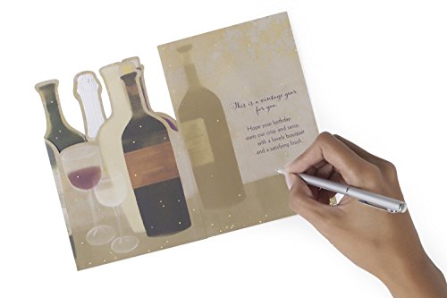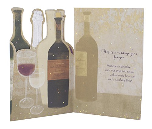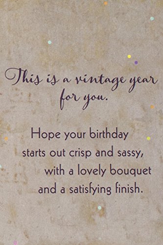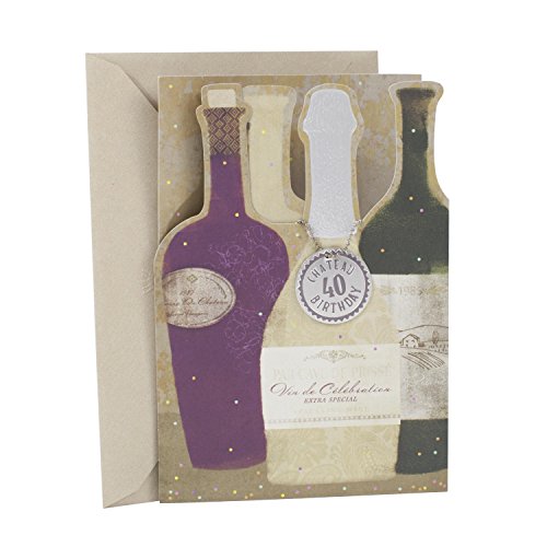 Studio : Hallmark Marketing Company, LLC (Office) Publisher : Hallmark Marketing Company, LLC (Office) Binding : Office Product Product Description Offer birthday wishes for friends, family, and others on their 40th with this card designed with illustrations of wine bottles, with the front message embossed on a metallic medallion. The message on the front of the card reads, "Chateau 40 Birthday Vin de Celebration Extra Special." Open the card to reveal the inside message, "This is a vintage year for you. Hope your birthday starts out crisp and sassy, with a lovely bouquet and a satisfying finish." The card measures 7.2 inches long by 5 inches wide made with high quality cardstock paper; an envelope is included. All Hallmark cards are made with paper from well-managed forests. Hallmark was founded in 1910 when 18-year-old J.C. Hall arrived in Kansas City, Missouri, with a couple of shoeboxes of postcards under his arm and the American dream in his heart. Today, more than a century later, Hallmark greeting cards are sold online and in nearly 40,000 retail stores across the globe and people continue to recognize the iconic Hallmark brand as "the very best." 0