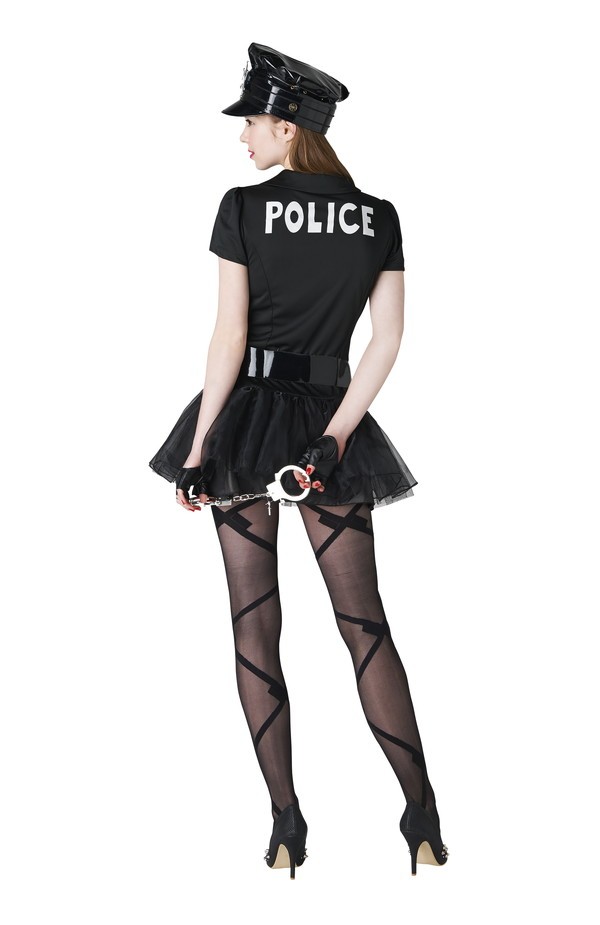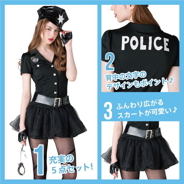 小物も充実の5点セット!ブラックで統一されたクールなポリスコスチュームです。ローウエストにふんわりと広がるスカートが、足を長く細く見せてくれるデザインです♪背中には「POLICE」のプリント入りだから、後ろ姿までカッコイイ☆