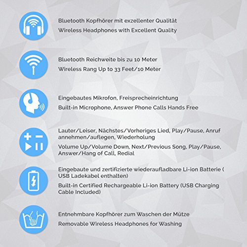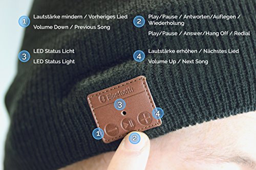 Bluetooth Wintermütze für warme Ohren auch an kalten Tagen. Die Lieblingsmusik immer dabei. Genießen Sie bis zu 5 Stunden Musikgenuss und behalten Sie dabei warme Ohren. Bluetooth Mütze. Entdecken Sie auch unsere anderen Bluetooth Mützen in ausgezeichneter Qualität und Polar Fleece Innenfutter. Der angenehme Tragekomfort wird unsere Bluetooth Mütze zu Ihrem lieblings Kleidungstück machen.