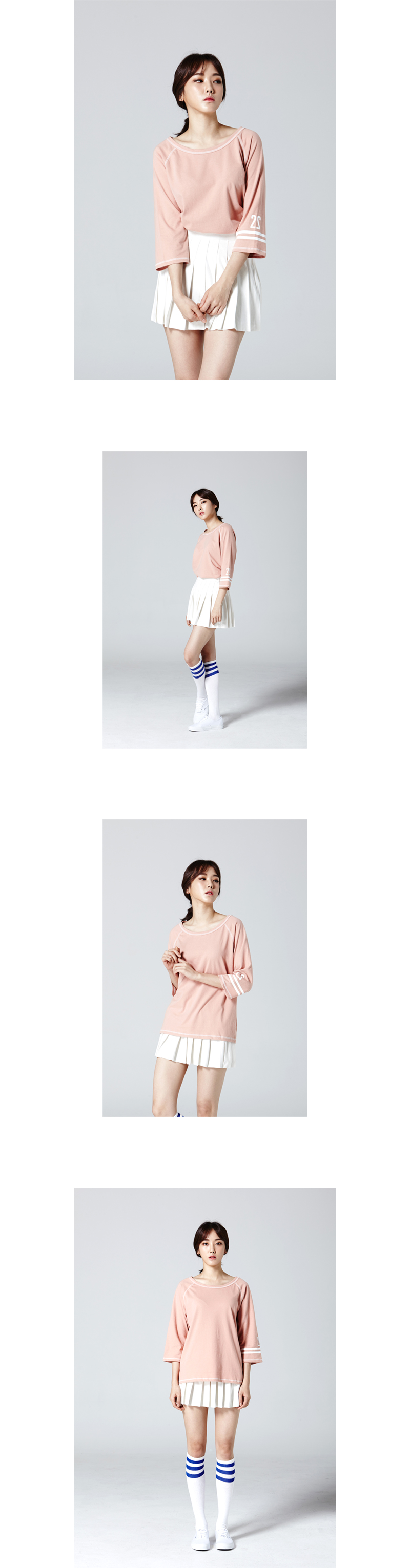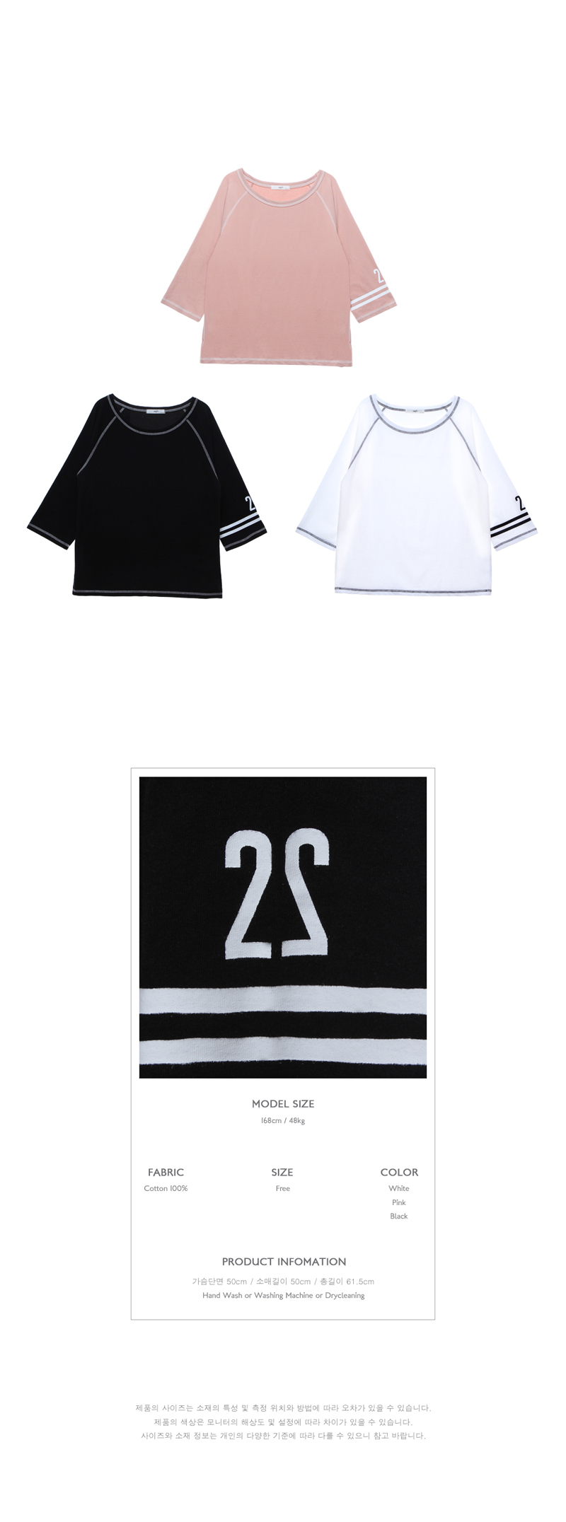 넓은 라운드 네크라인에 가이루빠 배색으로 포인트 준 7부 라그랑 티셔츠입니다.