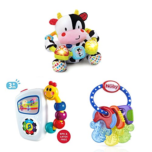 -. Feature : Baby Einstein Take Along Tunes Musical Toy: Single center button activates 7 classical melodies - Colorful lights dance across the screen to each song - Caterpillar bead chaser handle is easy for little hands to hold and take anywhere - Lead-free, BPA-free, and non-toxic; 2 AA batteries are required - Great for curious kiddos aged 3 to 36 months / Nuby purICE Gel Teething Key Ring: offers multiple textures to massage and stimulate your little one's gums - Gentle cooling - stays cool longer than water-filled soothers - BPA free - Plastic - Refrigerator/freezer safe - Hand wash - For ages 3 months and up / VTech Baby Lil' Critters Moosical Beads: Musical baby toy features a variety of fabric textures for baby tactile development; cuddle up with the soft cuddly stuffed animal cow - Music toy has an easy to grasp bead ring; bead ring has light-up buttons, and a spinning square for fine motor skills development - omes with 30+ playful songs, melodies, sounds and phrases; allows kids to have a moosical good time - Age Range: 3 months to 2 years - 2 AAA batteries for regular use