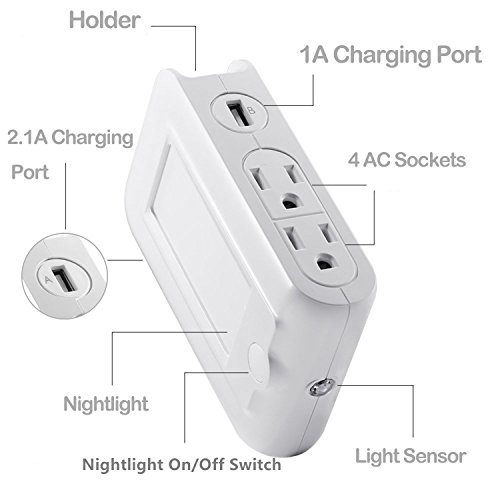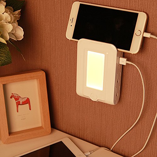 Wall Mount Surge Protector, OOLLWW All In One USB Wall Charger with 4 AC Outlet & 2 USB Charging Ports 3.1A with LED Night Light and Phone Holder