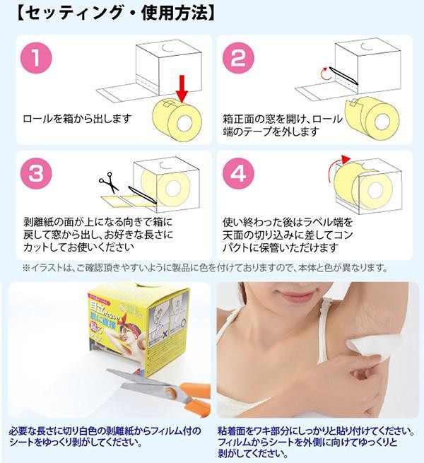 薄さ0.025mmの特殊透明フィルムを肌に直貼りするだけで、気になる汗ジミを抑えることが出来ます♪直貼りなのに肌なじみが良く、つけていることを忘れるほどの使用感。また、透明フィルムなのでノースリーブなどの服の時にもご使用頂けます!!ワキのサイズに合わせて長さ調節が可能なロールタイプです。 |