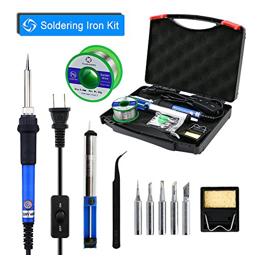 YOUSHARES Adjustable Temperature Soldering Iron Kit with Tool Box 7in1, included 60W 110V Soldering Gun Pen ON/OFF Switch, 5 Soldering Tips, Solder Sucker, Solder Wire, Tweezer, Cleaning Sponge Stand