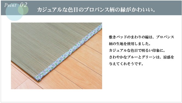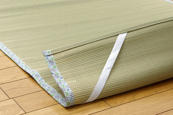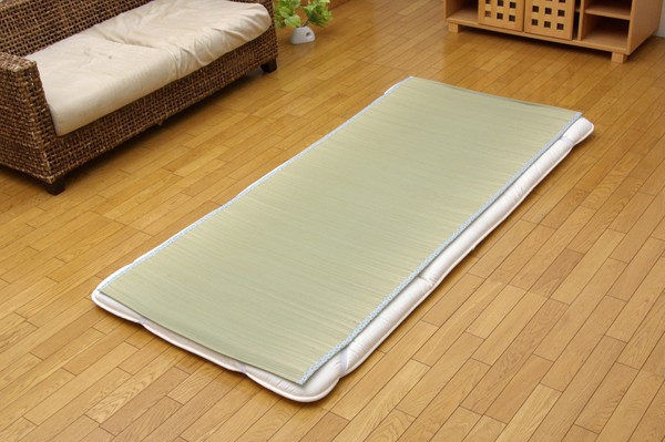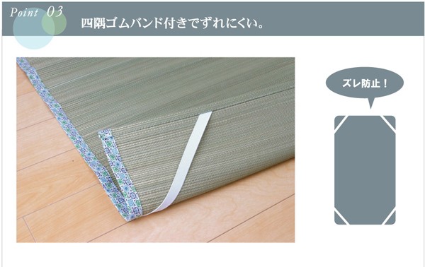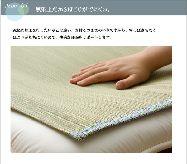 長時間、肌に接する寝具だからこそ、自然素材を使い、やわらかな質感にこだわりました。快眠い草の効能として1.綿の3倍の吸湿力 2.蒸れにくい。汗による湿気を吸うことにより温度を下げ快適な就寝を促します。 3.汗のにおいを軽減。汗のにおいの元となる化学物質を90%以上抑えます。などがあります。染料、染土を使わない国産(九州産)のしなやかなイ草を使用していますので、柔らかく、すべすべとしており身体にフィットします。裏面には四隅にゴムバンドが付いています。