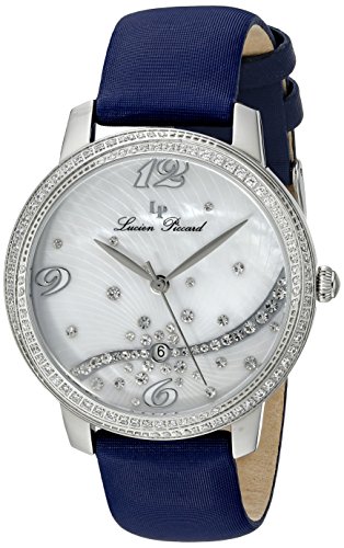 White mother of pearl dial with white crystal accents, silver tone hands and white and silver tone Arabic numerals; stainless steel bezel encrusted with white crystals; sapphitek crystal; stainless steel case; navy blue leather strap