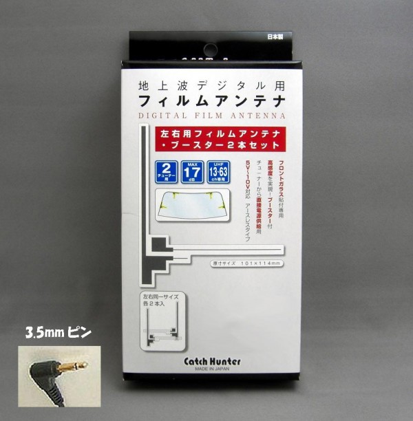 | 仕様 | 適合車種:2チューナー、3.5mm端子用 エレメントフィルムサイズ:105×27/15mm ブースター内蔵 ブースター利得:17dB 入力電圧:5~10V 消費電力:45mA×2 左右タイプ 保証期間:6ヶ月 |