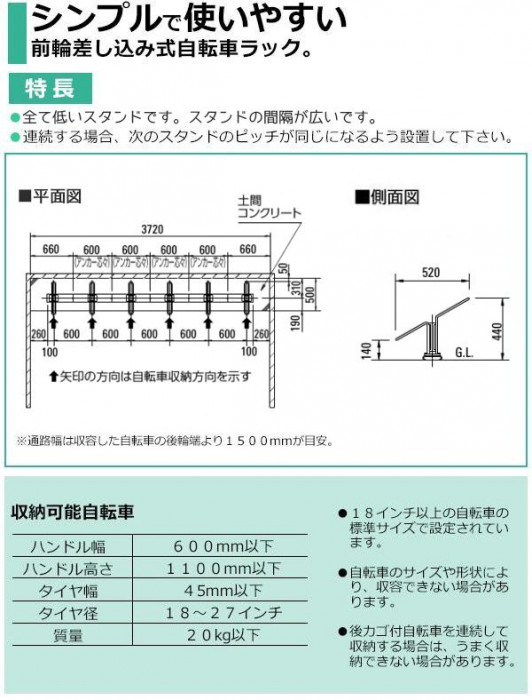 | 仕様 | 組立品 【収納可能自転車】 ハンドル幅:600mm以下 ハンドル高さ:1100mm以下 タイヤ幅:45mm以下 タイヤ径:18~27インチ 質量:20kg以下 【収容台数】 6台 【スタンドピッチ】 600mm |