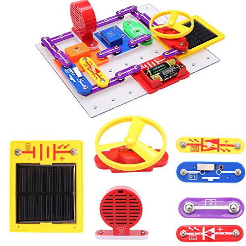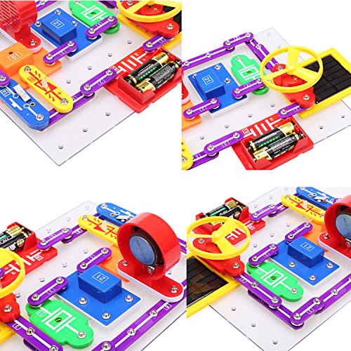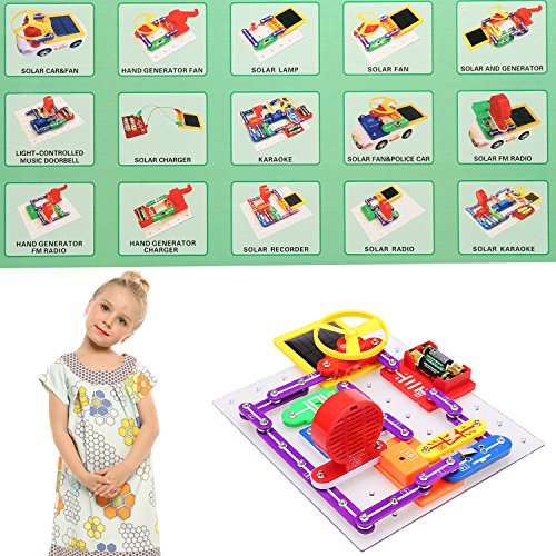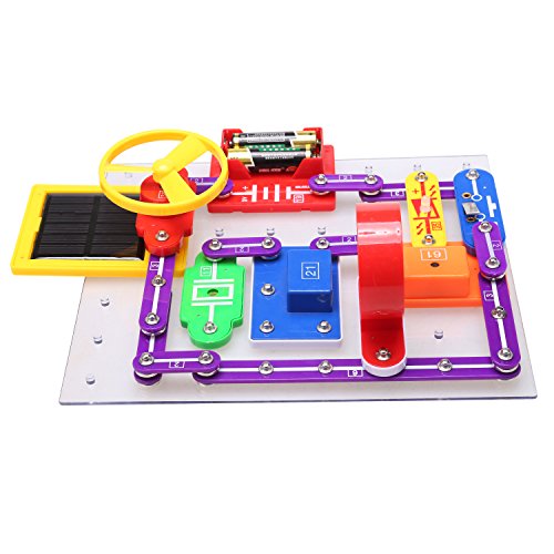 -. Feature : Build over 10000 projects with 43 parts, all of the parts have colored graphics that represent their real electronic names and symbols, make real working circuits, improve hands-on ability of your child. / You can build a radio, doorbell, burglar alarm, electric fans, flying saucer and more. The Electronic Discovery Kit is with integrated circuits (chip) so kids can set it up to play music. / Make interesting circuits, teaches your kids about electricity through the actual experiment. This product complies with safety standards EN 71, safe for your kid to play. / Understand the boring P.R.Inciple of electrical, acoustics, optics and magnetism with the funny educational toy, great gift for your kids to learn the science and physical. / Includes a car, you can build all kinds of circuit with it. Also includes full-color manual with easy to follow instructions and simple directions for each project.