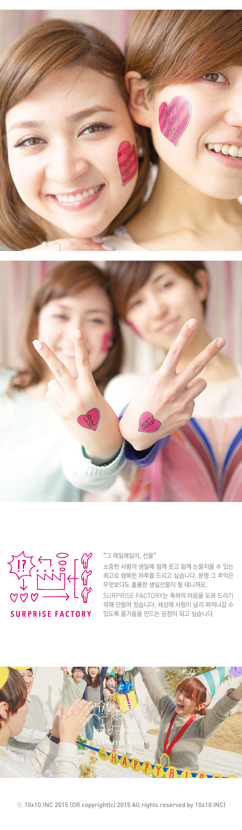 | - 사용법 1. 붙이고 싶은 부분을 깨끗하게 한 뒤 시트를 부착합니다. 2. 티슈나 타올 등에 물을 적셔 시트 위를 눌러 충분히 적십니다. 3. 20~30 초 후 천천히 필름을 제거하십시오. 4. 1 분 후 표면의 가장자리를 가볍게 물로 씻어주십시오. 5. 그대로 주위가 투명해질 때까지 잘 말립니다. * 제거 시에는 접착 테이프를 위에 붙인 뒤 함께 떼거나 클렌징 크림, 소독 알코올로 닦아냅니다. - 주의사항 피부가 약한 사람이나 알레르기가 있는 사람은 사용하지 마십시오. 특히 눈 근처 부위나 상처 위에는 절대로 붙이지 마십시오. 피부에 이상이 발견 될 때 또는 피부에 맞지 않을 때는 사용하지 마십시오. 오일이나 크림 등을 쓰면 벗겨 질 수 있으므로 주의하시기 바랍니다. 마찰 등에 때로는 의류 변색 될 수 있으므로 주의하시기 바랍니다. * 유아의 사용은 절대 삼가십시오. 또한 실수로 삼키거나 하지 않도록 주의하시기 바랍니다. |
