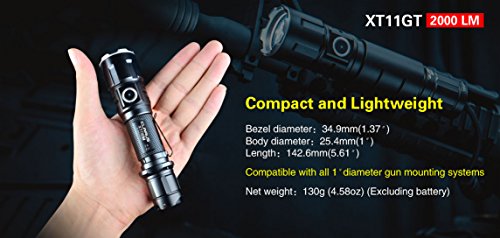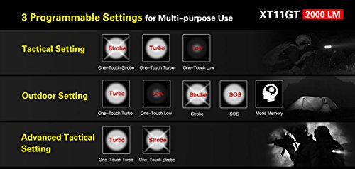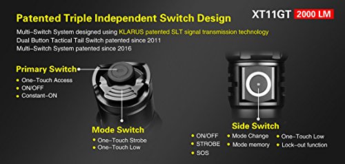Three Interfaces: Tactical Setting: Classic KLARUS XT series control. One-Touch Turbo; One-Touch Strobe; Side switch full control; versatile in all tasks. ◇Outdoor Setting: Specially designed for the wilderness. One-Touch Low; One-Touch Turbo;Multiple levels with memory; SOS function; suitable for all needs in Hiking, Camping or Search and Rescue.◇Advanced Tactical Setting: Turbo + Strobe; Side switch disabled. Immediate access to Turbo or Strobe for extreme tactical needs.