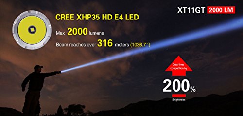 Newest CREE XHP35 HD E4 LED, 2000 Lumen Max Turbo output; beam reaches over 316 meters; industry leading performance