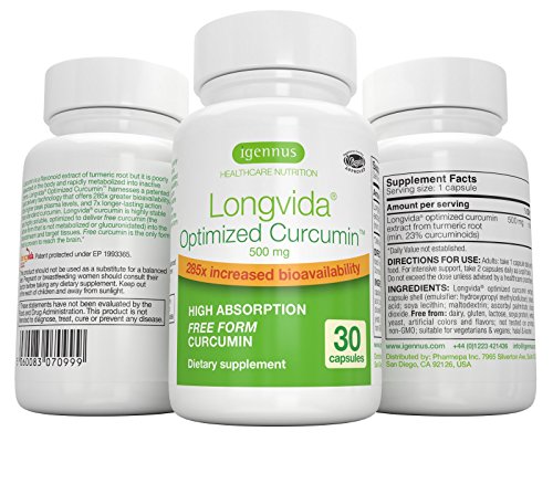 Curcumin is a flavonoid extract of turmeric root but it is poorly absorbed in the body and rapidly metabolized into inactive forms. Longvida Optimised Curcumin harnesses a patented lipid delivery technology that offers 285x greater bioavailability, 65x higher peak plasma levels, and 7x longer-lasting action than standard curcumin. Longvida curcumin is highly stable and highly soluble, optimized to deliver free curcumin (the active form that is not metabolized or glucuronidated) into the bloodstream and target tissues. Free curcumin is the only form that is proven to reach the brain. Longvida technology addresses factors associated with poor bioavailability by providing a unique phospholipid and fatty acid coating that surrounds the curcumin molecule and enables it to be transported into the lymphatic system rather than the circulatory system. Unlike the circulatory system, the lymphatic system bypasses the liver (the major organ for metabolism), so less curcumin is exposed to metabolic enzymes and remains in the free active form. Each product contains 30 capsules, providing a 1-month supply at the standard 500 mg daily dose. Free from: Dairy, gluten, lactose, salt, soya, yeast, wheat. No artificial colors, flavors or preservatives. Non-GMO. Igennus Healthcare Nutrition is a family-run, privately owned company based in Cambridge - the heart of life sciences innovation in the UK. Founded in 2004, we have specialist expertise in formulating and producing advanced supplements for therapeutic, clinical nutrition. Our products are often used by healthcare practitioners whose clients may have compromised digestion or whose sensitivity to certain additives may be heightened, so all of our supplements have been formulated and manufactured to be safe, effective and well tolerated. Our products use the best quality forms of ingredients, taking into account concentration, bioavailability and the dose required to provide demonstrable benefits to health.Feature