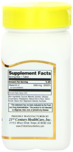-. Binding : Health and Beauty -. Brand : 21st Century -. Feature : It is hi-potency sublingual B-12 tablets. / It Promotes tissue growth and maintenance. / It is essential for the formation of red blood cells. -. Label : 21st Century -. Manufacturer : 21st Century -. MPN : 530529 -. PartNumber : 530529 -. ProductGroup : Health and Beauty -. ProductTypeName : HEALTH_PERSONAL_CARE -. Publisher : 21st Century -. Studio : 21st Century -. Title : 21st Century B-12 5000 Mcg Sublingual Tablets, 110-Count