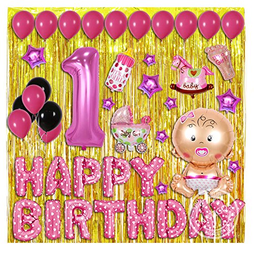 -. Feature : Celebrate your little girl with 1st birthday balloons. Our balloon for her 1st birthday makes a sweet surP.R.Ise. / What you will get:2xfoil fringe curtains 1. Number 1 balloon 40 inchs. 1 30inch baby girl foil balloon. 1 22inch it's a girl baby hat all support helium. / 1 31inch large baby stoller. 1 30inch baby bottle all support helium. 2 balloon ribbion egg for free color random. / 13pcs 16inch pink happy birthday alphabet balloon. 9pcs 10inch pink star balloon(all can't fill helium). / 5pcs 10inch pink and 5pcs white latex balloon support helium pls use scotch tape stick balloon on wall.