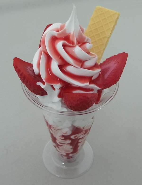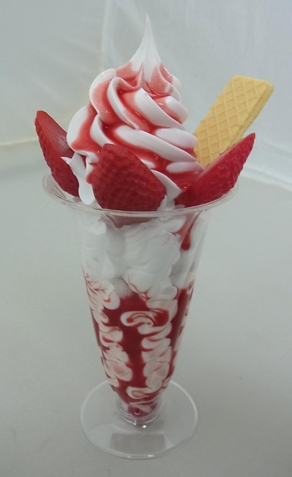 みんな大好きなパフェを職人が食品サンプルでつくってみました。クリームとあまそうないちごソースたっぷりのいちごパフェです。どっきりの誕生日プレゼントにもぴったりです♪ |