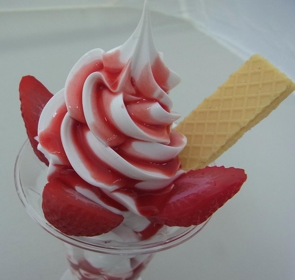 | みんな大好きなパフェを職人が食品サンプルでつくってみました。クリームとあまそうないちごソースたっぷりのいちごパフェです。どっきりの誕生日プレゼントにもぴったりです♪ |