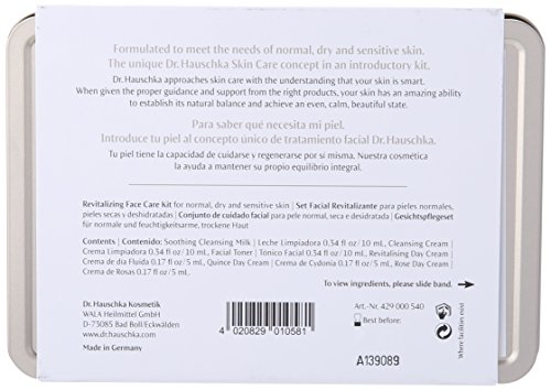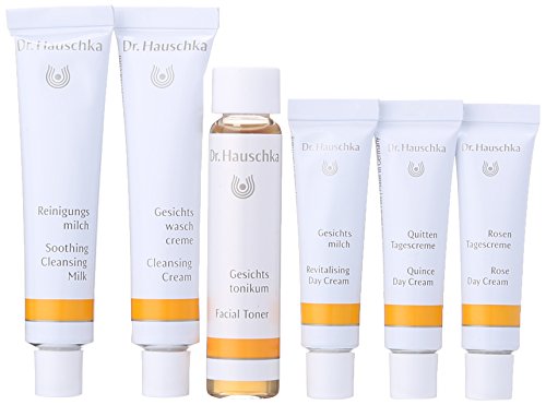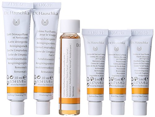 Introduce your skin to the natural, soothing benefits of Dr.Hauschka. Whether your traveling or simply looking for a start to great skin, Dr.Hauschka Face Care Kit - Normal works to soothe and hydrate normal, sensitive, and dry skin. The set includes travel sizes of Cleansing Cream (0.34 fl. oz.), Cleansing Milk (0.34 fl. oz.), Facial Toner (0.34 fl. oz.), Moisturizing Day Cream (0.17 fl. oz.), Rose Day Cream (0.17 fl. oz.), and Quince Day Cream.Feature