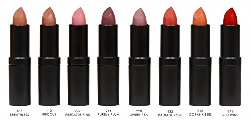 - VERSATILE- 7 gorgeous shades of certified vegan silky and smooth lipstick by Aneley Cosmetics, designed to empower you and get you that unique look in the most natural way. Hibiscus, Red wine, Purely Plum, Sweet Pea, Breathless, Radiant Rose, Precious Pink & Coral kisses. There is a perfect shade for everyone; HIgh pigmented vibrant natural shades that are gluten-free, fragrance-free, paraben-free, formulated to last.