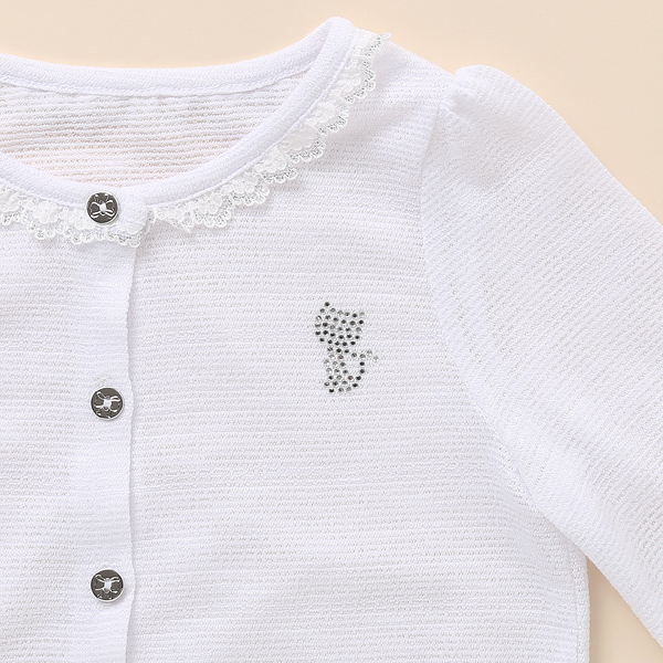 상품설명 은근한 조직감의 톈션있는 원단을 활용해 간절기겸 아우터로 활용성 높은 가디건 입니다. 네크라인이 적당히 파여있어 답답하지 않고, 실버 단추와 크리스탈 고양이 핫피스가 블링블링하게 장식되어 있습니다. 소매와 밑단에 살짝 잡힌 셔링이 귀여운 라인을 만들어 줍니다. 어디에나 간편하게 걸치기 좋은 심플한 라인의 아우터입니다.