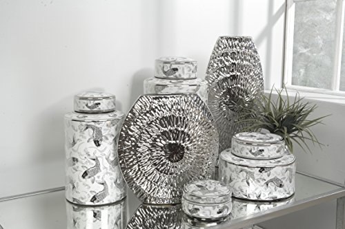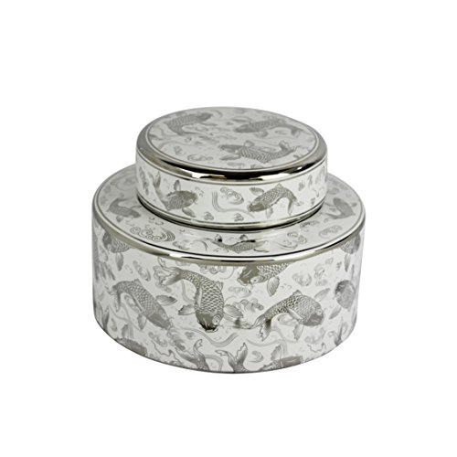 Sagebrook Home Ceramic Koi Design Covered Jar, Silver/White