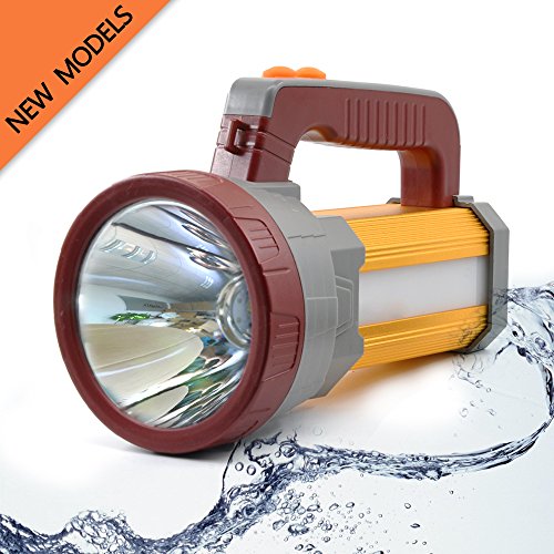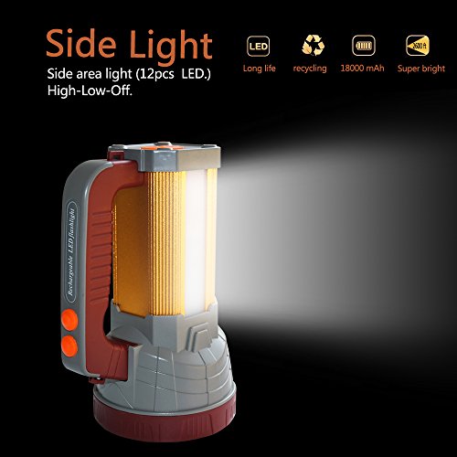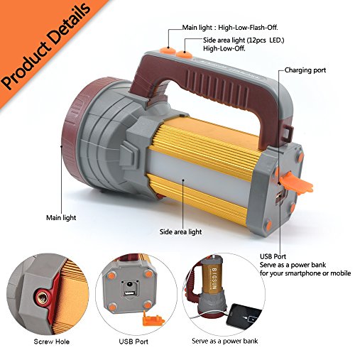 1) Flashlight Type: Hand-held flashlight 2) Power supply: Built-in 15600 mA lithium battery 3) headlight lighting mode: light - weak light - flashing 4) Auxiliary light lighting mode: light - weak light 5) Can be on the tripod: searchlight bottom screw holes, you can connect the tripod to use 6) USB output: USB output port on the tail of flashlight, which can charge digital products such as mobile phone, MP3, IAPD 7) Internal wiring applies the high efficient booster circuit, working voltage is wide and can utilize the batteries in the largest extent 8) Waterproofing design(But Can't put it into water directly) 9) Made of high quality aluminum alloy and ABS, this flashlight is sturdy and durable enough for long time daily using