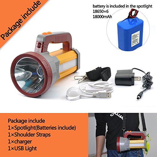 Package: 1x Flashlight (Built-in 15600 mAh lithium battery) 1x Shoulder strap 1x Charger 1x USB light