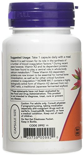 -. Binding : Health and Beauty -. Brand : Now Foods -. Feature : NOW Foods' MK-7 vitamin K2 contains a highly biologically active form of vitamin k2 derived from non-GMO natto / Vitamin K2 and its dependent proteins have been discovered to be of vital importance for bone and vascular health / These vitamin k2-dependent proteins are now known to play pivotal roles in the physiology of bone mineralization -. IsAdultProduct : 0 -. Label : Now Foods -. Manufacturer : Now Foods -. MPN : 0992 -. PackageQuantity : 1 -. PartNumber : 0992 -. ProductGroup : Health and Beauty -. ProductTypeName : HEALTH_PERSONAL_CARE -. Publisher : Now Foods -. Studio : Now Foods -. Title : Now Foods Vitamin K-2 (MK7) Veg Capsules, 100 mcg, 60 Count