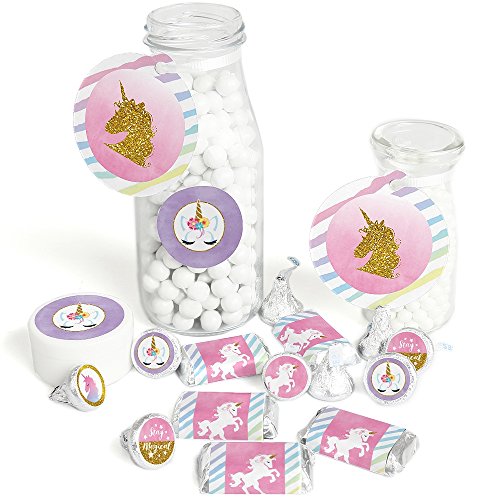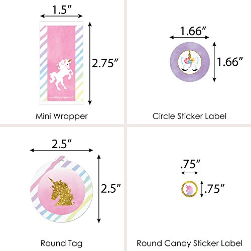- VARIETY OF STYLES & SIZES! Magical Unicorn Baby Shower or Birthday Party Favor Kit includes stickers and tags to help you create numerous party favors. Mini Candy Bars (20 wrappers, 1 3/8 inches wide x 2 5/8 inches high, fits Hershey® miniature candy bars); Circle Sticker Labels (24 stickers, 1 2/3 inches diameter) 20 Round Tags (2 ½ inches diameter, die cut & ready to use), and Round Candy Labels (108 small round stickers, .75 inches diameter, fits Hershey® Kisses® or other small, round candy).