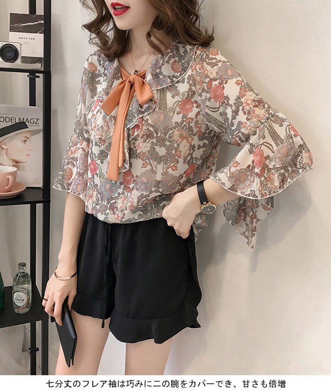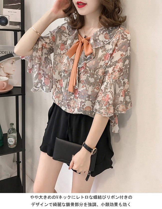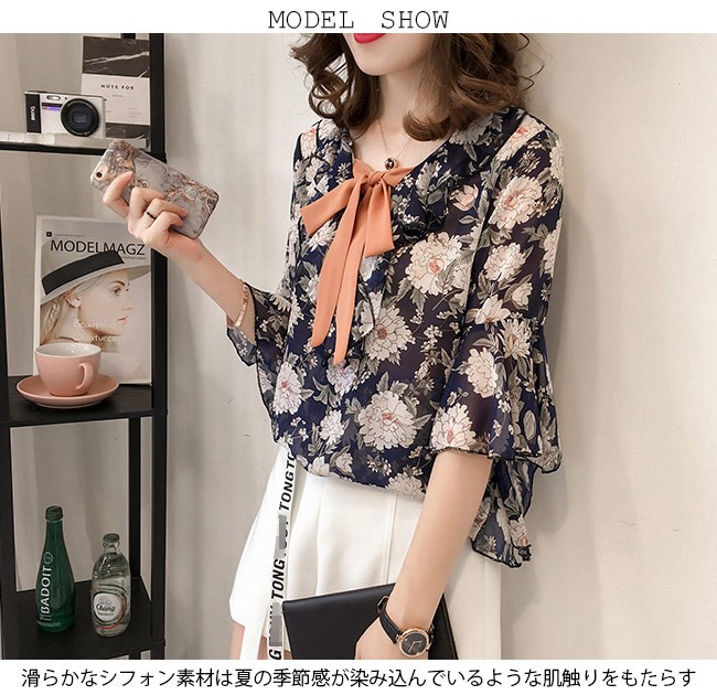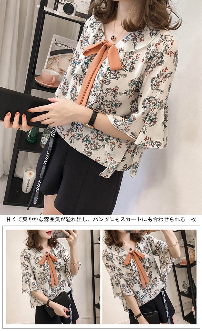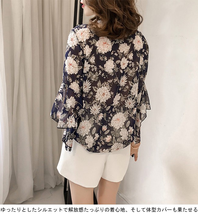 シフォンブラウス 花柄 七分丈袖 レディース ブラウス Vネック ゆったり 夏物 トップス 体型カバー レトロ フレア袖口 通勤 フェミニンレディース用のシフォンブラウスが登場滑らかなシフォン素材は夏の季節感が染み込んでいるような肌触りをもたらす落ち着きのある地色に上品な花柄プリントで女性ならではの優しさを引き立てるやや大きめのVネックにレトロな蝶結びリボン付きのデザインで綺麗な鎖骨部分を強調、小顔効果も効く七分丈のフレア袖は巧みに二の腕をカバーでき、甘さも倍増ゆったりとしたシルエットで解放感たっぷりの着心地、そして体型カバーも果たせる甘くて爽やかな雰囲気が溢れ出し、パンツにもスカートにも合わせられる一枚カラー:1 2 3素材 ポリエステルサイズ(cm) M L XL 2XL 3XL 4XLM 着丈60 肩幅38 バスト96L 着丈61 肩幅39 バスト102XL 着丈62 肩幅41 バスト1082XL 着丈63 肩幅42 バスト1143XL 着丈64 肩幅44 バスト1204XL 着丈65 肩幅45 バスト126ご注意:※サイズは平置きサイズです。素人採寸ですので、若干の誤差がございます、ご了承ください。